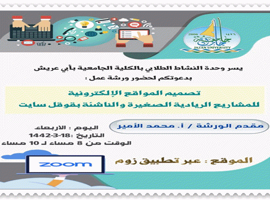 نفذت وحدة النشاط الطلابي بالكلية ورشة عمل في تصميم المواقع الالكترونية للمشاريع الريادية الصغيرة والناشئة باستخدام قوقل سايت عبر منصة زوم وذلك يوم الأربعاء الموافق 18-3-1442هـ في تمام الساعة الثامنة إلى الساعة العاشرة مساء قدمها أ.محمدالأمير. الورشة