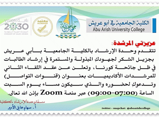 تحت إشراف عميدة الكلية الجامعية بأبي عريش د. آسيا علي حيدر الشيخ، نظمت وحدة التعليم الإلكتروني وتقنية المعلومات بالكلية ورشة عمل بعنوان " كيفية استخدام برنامج زوم " لمنسوبات الكلية للفصل الدراسي الأول للعام الجامعي 1441- 1442هـ , يوم الثلاثاء 1442/4