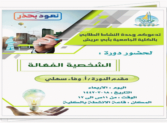 أقامت وحدة النشاط الطلابي بالكلية دورة تدريبية عن "الشخصية الفعالة" قدمتها أ. وفاء سهلي يوم الأربعاء الموافق 1442/3/18هـ في تمام الساعة الحادية عشر صباحا بقاعة الأنشطة الطلابية داخل الكلية مع مراعاة جميع الإجراءات الاحترازية أثناء التواجد داخل القاعة