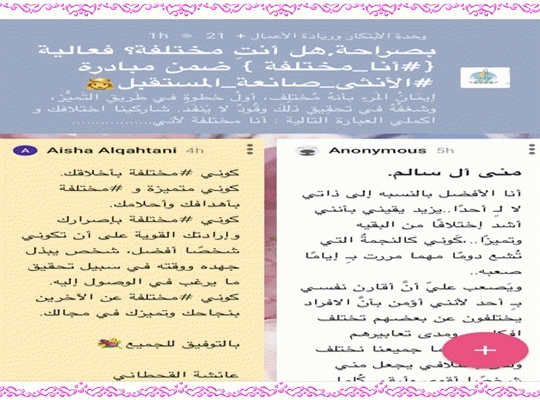 ضمن مبادرة الأنثى صانعة للمستقبل أطلقت وحدة الابتكار وريادة الأعمال ممثلة بمنسقة الوحدة م.منى يحي أبو غبرة فعالية (أنا مختلفة) على صفحة البادلت وذلك ابتداء من مساء يوم السبت 1442/03/07هـ ولمدة اسبوعين، لجذب الطالبات ولفت انتباههن نحو وحدة الابتكار