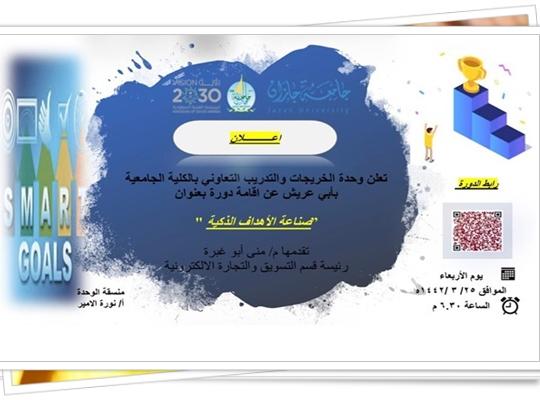 نظمت وحدة الخريجات والتدريب التعاوني بالكلية دورة تدريبة بعنوان (صناعة الاهداف الذكية) تحت إشراف عميدة الكلية د. آسيا علي الشيخ. كان ذلك يوم الأربعاء 1442/3/25هـ. قدمتها م. منى يحيى أبو غبرة رئيسة قسم التسويق والتجارة الالكترونية بالكلية، بتنسيق