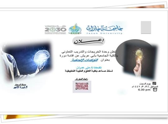 نظمت وحدة الخريجات بالكلية دورة تدريبة بعنوان (التوكيدات الايجابية) تحت إشراف عميدة الكلية د. آسيا علي الشيخ. كان ذلك يوم السبت 1442/3/28هـ . قدمتها د. منى عمران استاذ مساعد بكلية العلوم الطبية التطبيقية, بتنسيق وإشراف منسقة الوحدة أ.نورة الأمير