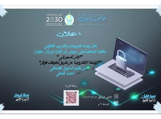 نظمت وحدة الخريجات بالكلية دورة تدريبة بعنوان بعنوان (الارشفة الالكترونية عن طريق تطبيقات قوقل) تحت إشراف عميدة الكلية د. آسيا علي الشيخ. كان ذلك يوم الإثنين 1442/04/01هـ قدمتها أ. هند الثمالي المعيدة بقسم تقنية وامن المعلومات، بتنسيق وإشراف منسقة