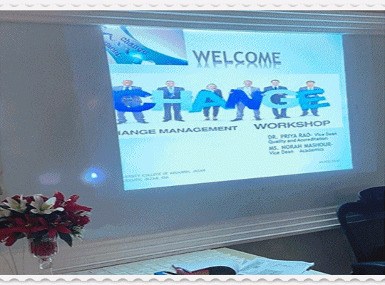 أقامت وكالة الكلية للتطوير يوم الاثنين الموافق 1441/06/30هـ ورشة عمل بعنوان (إدارة التغيير) نفذتها د.بريا راو وكيلة الكلية للتطوير بحضور مجموعة من أعضاء هيئة التدريس بالكلية وبعض الكليات الأخرى. تحدثت خلالها عن ما هو التغيير بصفة عامة، ما هي إدارة