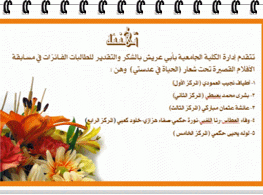 أقامت وحدة النشاط الطلابي مسابقة بعنوان الأفلام القصيرة والفواصل تحت شعار (الحياة في عدستي) من تنفيذ أستاذ مناهج وطرق التدريس وتكنولوجيا التعليم المساعد جيهان سعد الدبوسي يوم الأربعاء 1 جمادى الآخرة 1440هـ،وتم فيها تحديد موعد الفرز وتكريم الفائزات