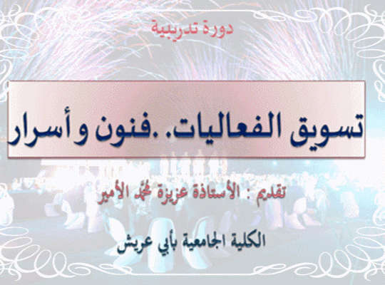 أقامت وحدة النشاط الطلابي دورة بعنوان (كيفية تسويق الفعاليات) من تنفيذ م.عزيزة محمد الأمير يوم الخميس 2جمادى الآخرة1440هـ، بحضور طالبات وعدد من منسوبات الكلية. بدأ البرنامج بالتعريف بالفعالية، ولمن تقدم وماذا نحتاج، ثم تطرقت إلى مزايا وفوائد التخطيط