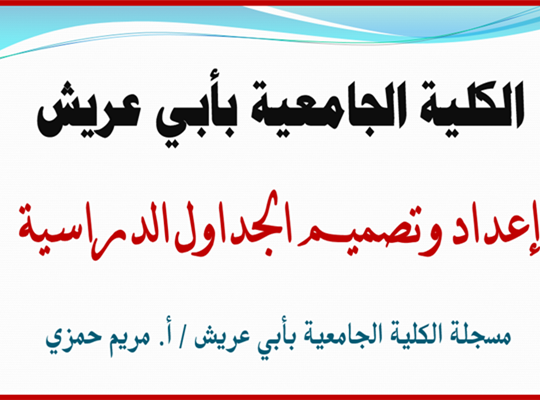 شاركت مديرة تسجيل الكلية الجامعية بأبي عريش الأستاذة المتميزة مريم حمزي بشرح طريقة إعداد الجدول الدراسي ضمن ورشة العمل التي نظمتها وحدة القبول والتسجيل بشطر الطالبات بعنوان( تفعيل خدمة التسجيل الذاتي). وقامت أ.مريم حمزي تلبية لرغبة العمادة بشرح إعداد