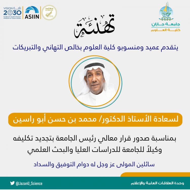 تهنئة للأستاذ الدكتور محمد أبوراسين بمناسبة صدور قرار معالي رئيس الجامعة بتجديد تكليفه وكيلا للجامعة للدراسات العليا والبحث العلمي