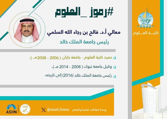 #رموز_العلوم (1) معالي رئيس جامعة الملك خالد أ.د. فالح بن رجاء الله السلمي -عميد كلية العلوم سابقاً - جامعة جازان (2006 - 2008 م).