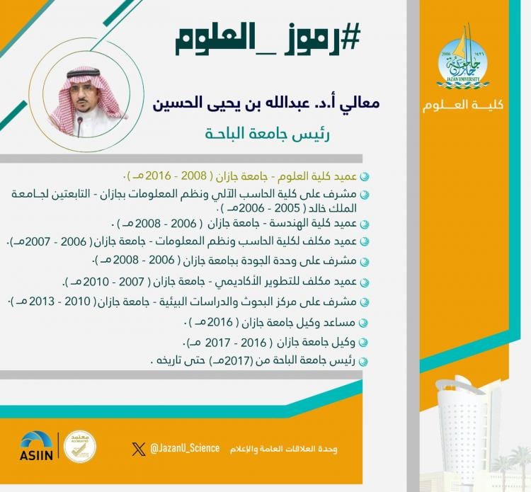 #رموز_العلوم (2) معالي رئيس جامعة الباحة أ.د. عبدالله بن يحيى الحسين -عميد كلية العلوم سابقاً- جامعة جازان (2008 - 2016م).