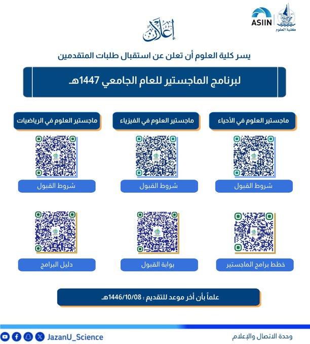 يسر #كلية_العلوم أن تعلن عن استقبال طلبات المتقدمين لبرنامج ماجستير العلوم في الفيزياء والأحياء والرياضيات للعام الجامعي 1447هـ اعتباراً من يوم الثلاثاء 18/ 09 / 1446 هـ إلى يوم الأحد 08/ 10/ 1446 هـ