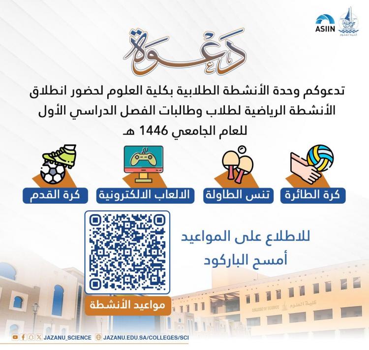 تدعوكم وحدة الأنشطة الطلابية بكلية العلوم لحضور انطلاق الأنشطة الرياضية للطلاب والطالبات للفصل الدراسي الأول 1446هـ، للتفاصيل أمسح الباركود