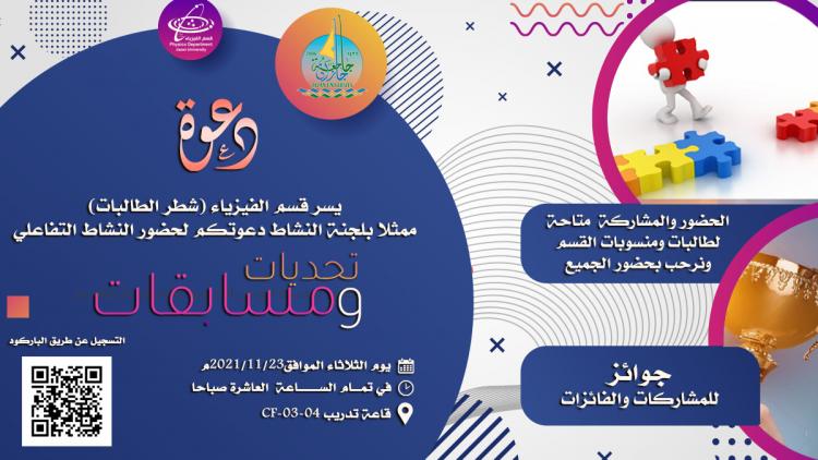 دعوة لحضورالنشاط التفاعلي "تحديات و مسابقات" بشطرالطالبات