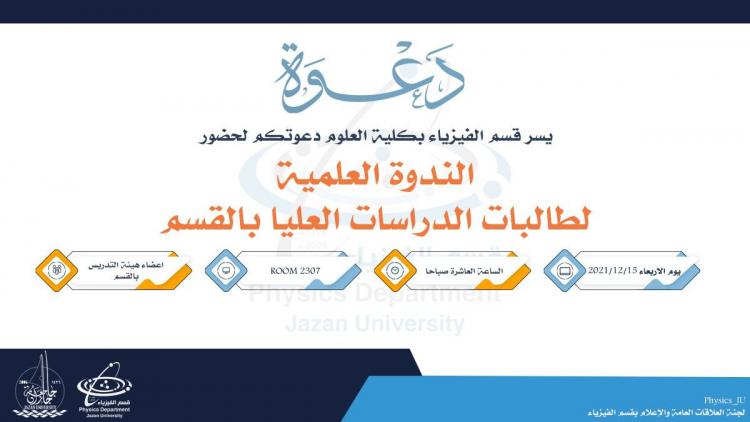 يسر قسم الفيزياء دعوتكم لحضور "الندوة العلمية لطالبات الدراسات العليا بالقسم"