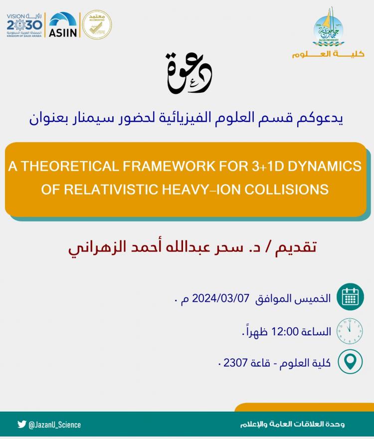محاضرة بعنوان "A THEORETICAL FRAMEWORK FOR 3+1D DYNAMICS OF RELATIVISTIC HEAVY-ION COLLISIONS"