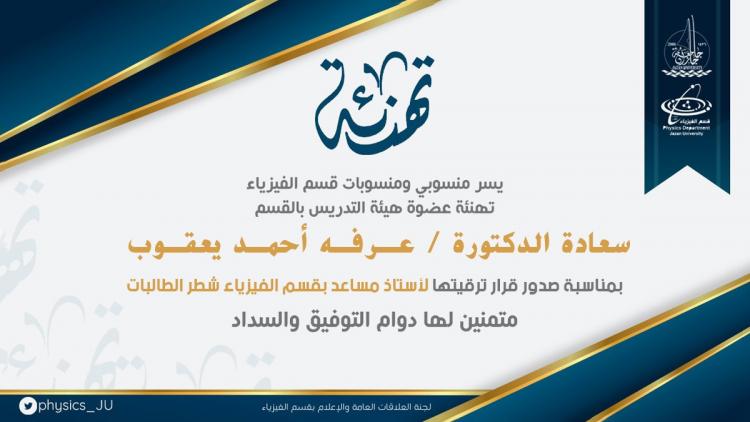 تهنئة الدكتورة عرفه يعقوب بمناسبة ترقيتها لدرجة استاذ مساعد
