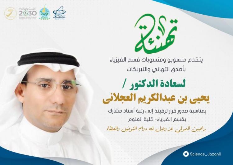 لسعادة الدكتور / یحیی بن عبدالكريم العجلانی ببمناسبة صدور قرار ترقيتة إلى رتبة أستاذ مشارك بقسم الفيزياء - كلية العلوم