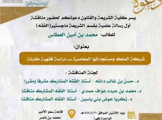 يسر كلية الشريعة والقانون دعوتكم لحضور مناقشة أول رسالة علمية بقسم الشريعة ماجستير ( الفقة ) للطالب : محمد بن أمين العطاس بعنوان شركة الملك ومستجداتها المعاصرة - دراسة فقهية مقارنة
