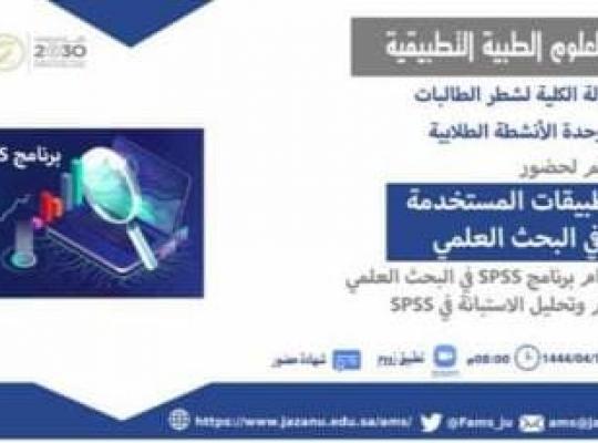 تدعوكم وكالة الكلية لشطر الطالبات ممثله بوحدة الأنشطة الطلابية لحضور دورة التطبيقات المستخدمة في البحث العلمي (برنامج SPSS في البحث العلمي-تصميم وتحليل الاستبانة في SPSS) يقدمها د/ محمد زينو الاربعاء الموافق 1444/04/15هـ الزمن:8:00م تطبيق الزووم تم