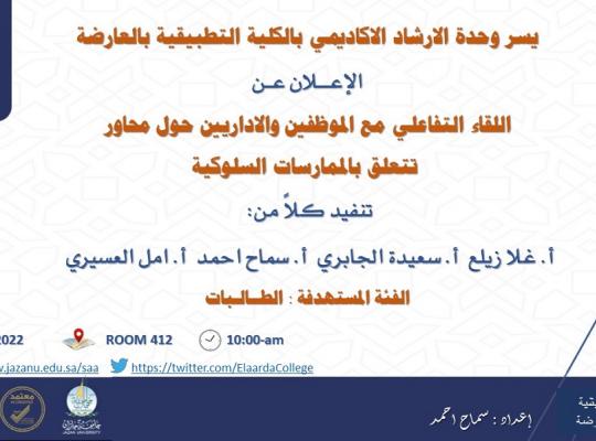 الإعلان عن اللقاء التفاعلي مع الموظفين والإداريين حول محاور تتعلق بالممارسات السلوكية