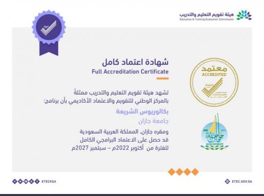 تشهد هيئة تقويم التعليم والتدريب ممثلة بالمركز الوطني للتقويم والاعتماد الأكاديمي بأن برنامج : بكالوريس الشريعة جامعة جازان ، المملكة العربية السعودية ، قد حصل على الاعتماد البرامجي الكامل للفترة من أكتوبر 2022 م - سبتمبر 2027 م