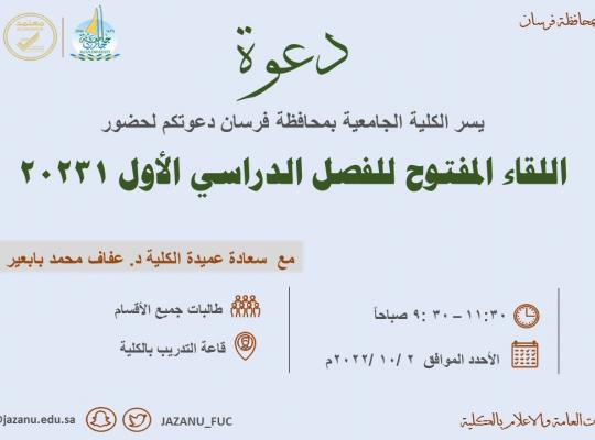 يسر الكليةالجامعيةبفرسان دعوتكم لحضور " اللقاء المفتوح للفصل الدراسي الأول ٢٠٢٣١ " مع سعادة عميدة الكلية د. عفاف بابعير 🗓 الأحد ٢٠٢٢/١٠/٢ 🕘من الساعه ٩:٣٠ ص الى ١١:٣٠ 📍قاعة التدريب بالكلية الفئة المستهدفة: طالبات الكلية بجميع الأقسام