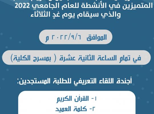 يسر وحدة الشؤون الطلابية بالتعاون مع وحدة العلاقات العامة بالكلية دعوتكم لحضور اللقاء الإرشادي للطلبةالمستجدين و الذي سيقام بمسرح الكلية في تمام الساعة ( الثانية عشرة ) وبعد اللقاء سيتم تكريم الطلبةالمتميزين لعام 2022 ..