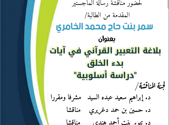 يدعوكم قسم اللغة العربية وآدابها بكلية الآداب والعلوم الإنسانية لحضور مناقشة علمية لرسالة الماجستير المقدمة من الطالبة/ سمر بنت حاج محمد الخامري ، وعنوانها: (بلاغة التعبير القرآني في آيات بدء الخلق "دراسة أسلوبية") وتتكون لجنة المناقشة والحكم على