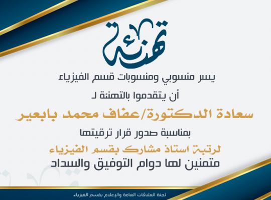 تهنئة منسوبي القسم لسعادة د. عفاف بابعير بمناسبة الترقية العلمية إلى رتبة " أستاذ مشارك "