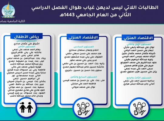 الطالبات اللاتي ليس لديهن غياب طوال الفصل الدراسي الثاني من العام الجامعي ١٤٤٣هـ بالكلية الجامعية بصامطة