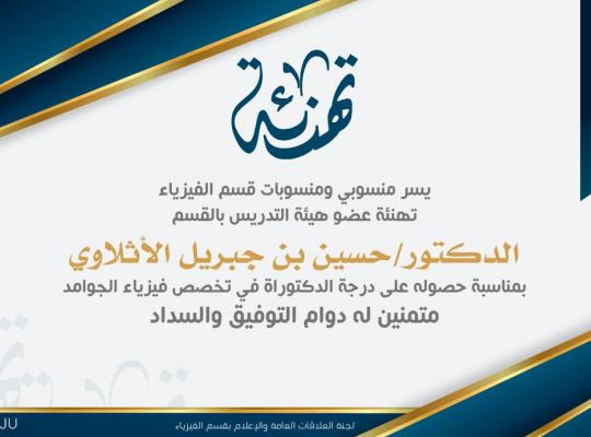 يسر منسوبي و منسوبات القسم تهنئة د. حسن بن حبريل الأثلاوي بمناسبة حصولة علي درجة الدكتوارة في تخصص فيزياء الجوامد سائلين المولى عز وجل لها دوام التوفيق والسداد.