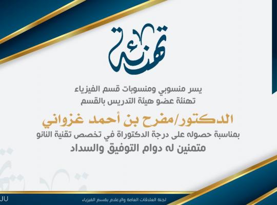يسر منسوبي و منسوبات القسم تهنئة د. مفرح بن أحمد غزواني بمناسبة حصولة علي درجة الدكتوارة في تخصص تقنية النانو سائلين المولى عز وجل لها دوام التوفيق والسداد.