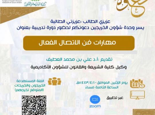 يسر وحدة الإرشاد الأكاديمي بالكلية بالتعاون مع لجنة الدراسات العليا بقسم اللغة العربية دعوتكم لحضور ورشة علمية يقدمها الدكتور/ ممدوح علي محمود، بعنوان : (كيف نستفيد من المكتبة الرقمية السعودية) الساعة الثامنة من مساء الأربعاء ٢٠٢١/١١/١٧م عبر منصة