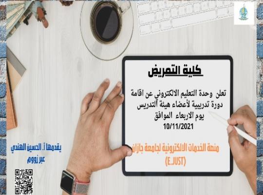 تعلن وحدة التعليم الابكتروني عن إقامة دورة تدريبية لأعضاء هيئة التدريس بعنوان كيفية التعامل مع منصة الخدمات الالكترونية وذلك يوم الاربعاء الموافق 10نوفمبر 2021 م في تمام الساعة 8 مساءا ويقدمها أ / الحسين هندي