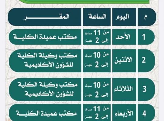 تحرص الكلية الجامعية بصبيا الوقوف على احتياجات طالباتها والعمل على تلبيتها، وتسخير كافة الامكانات في الكلية لخدمة الطالبات، من خلال الإعلان عن مواعيد لاستقبال الطالبات خلال أيام الأسبوع الدراسي في مكاتب كلاً من : - عميدة الكلية ووكيلاتها. - رئيسات