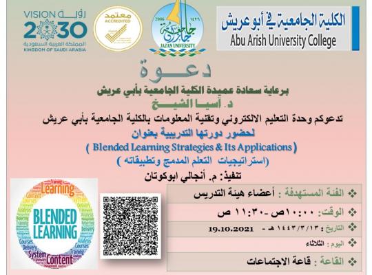 تعلن وحدة التعليم الإلكتروني وتقنية المعلومات عن إقامة دورة تدريبية بعنوان (استراتيجيات التعلم المدمج وتطبيقاته) يوم الثلاثاء 1443/03/13هـ الموافق 2021/10/19م، من الساعة العاشرة وحتى الحادية عشر والنصف صباحاً بقاعة الاجتماعات بالدور الأول. من تقديم م