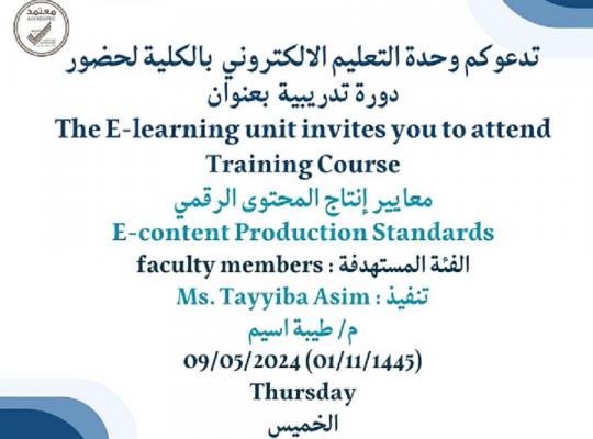تدعوكم وحدة التعليمالالكتروني بالكلية لحضور دورة تدريبية بعنوان معايير إنتاج المحتوى الرقمي