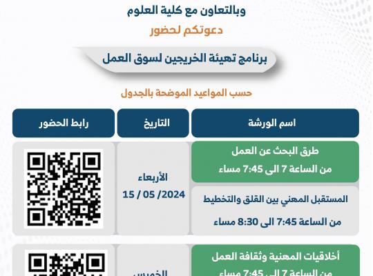 يسر مركز علاقات الخريجين والتوظيف بعمادة شؤون الطلاب دعوتكم لحضور برنامج "تهيئة الخريجين لسوق العمل" يوم الأربعاء و الخميس ١٥-١٦/ ٠٥/ ٢٠٢٤م من الساعة ٧م - إلى ٨:٣٠ م عبر منصة Blackboard للحضور يرجى مسح الباركود الموضح بالإعلان