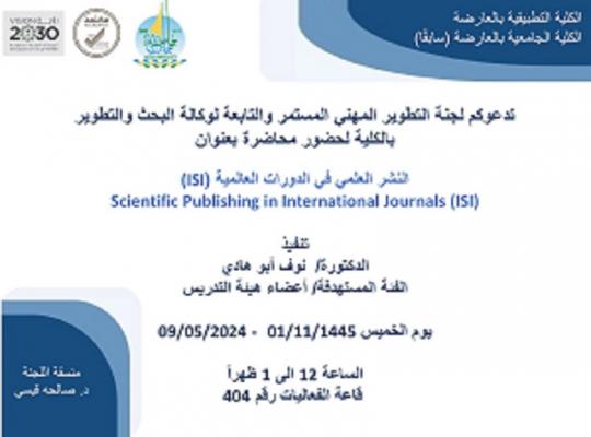 تدعوكم لجنة التطوير المهني المستمر والتابعة لوكالة البحث والتطوير بالكلية لحضور محاضرة بعنوان (النشر العلمي في الدورات العالمية(151)