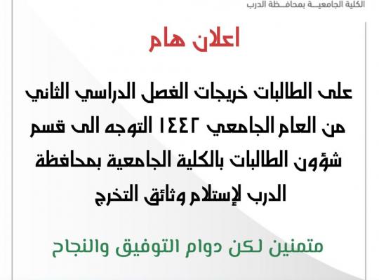 أعلان هام على الطالبات خريجات الفصل الدراسي الثاني من العام الجامعي 1442 التوجه الى قسم شؤون الطالبات بالكلية الجامعية بمحافظة الدرب لإستلام وثائق التخرح متمنين لكن دوام التوفيق والنجاح
