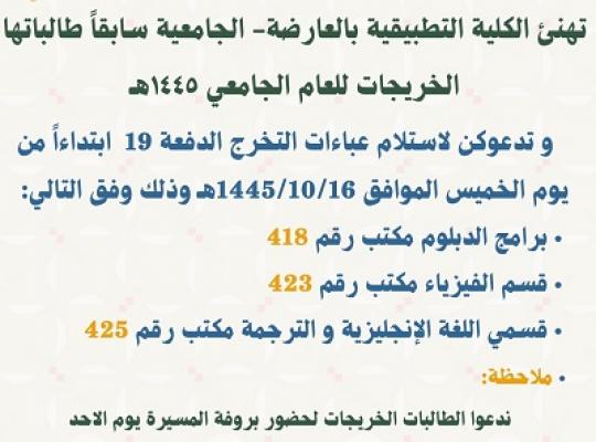 تهنئ الكلية التطبيقية بالعارضة - الجامعية سابقاً طالباتها الخريجات للعام الجامعي 1445هـ