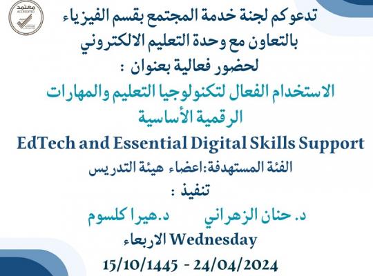 تدعوكم لجنة خدمة المجتمع بقسم الفيزياء بالتعاون مع وحدة التعليم الالكتروني لحضور فعالية بعنوان (الاستخدام الفعال لتكنولوجيا التعليم والمهارات الرقمية الأساسية)