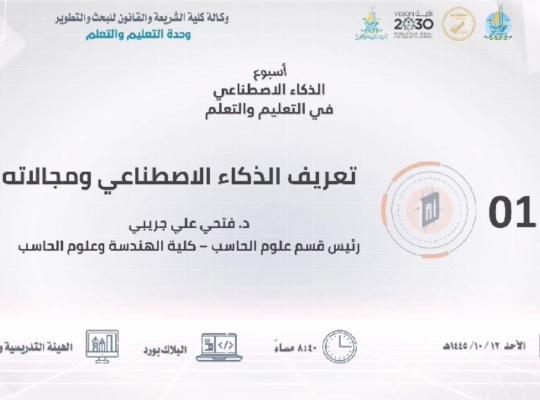 برعاية فضيلة عميد كلية الشريعة والقانون دعلي بن طاهر صميلي وبإشراف وكالة الكلية للبحث والتطوير تنظم وحدة التعليم والتعلم الذكاء الاصطناعي في التعليم والتعلم من يوم غد الأحد إلى الثلاثاء بالتعاون مع قسم الحاسب في كلية الهندسة وعلوم الحاسب الفئة