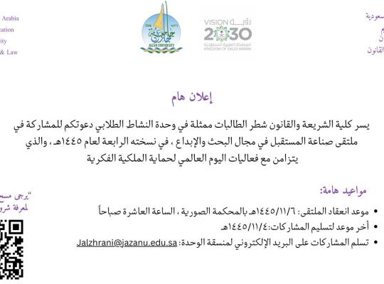يسر كلية الشريعة والقانون شطر الطالبات ممثلة في وحدة النشاط الطلابي دعوتكم للمشاركة في ملتقى صناعة المستقبل في مجال البحث والابداع ..