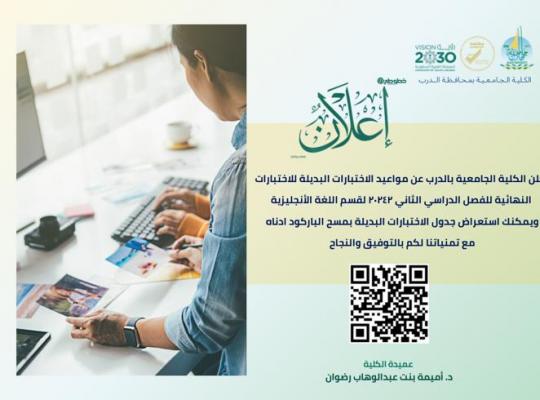 تعلن الكلية الجامعية بالدرب عن جدول الاختبارات البديلة لقسم اللغة الانجليزية للعام الجامعي 20242