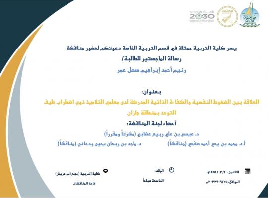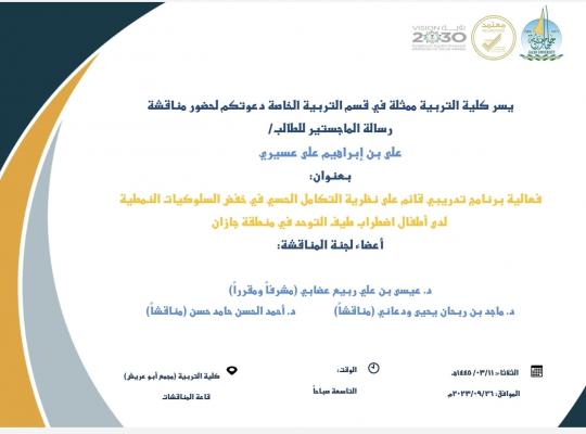 إعلان مناقشة رسالة الماجستير للطالب علي عسيري