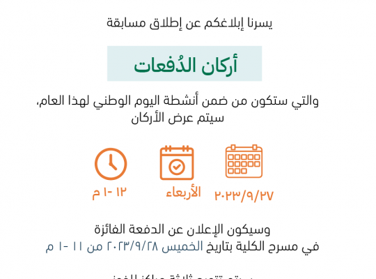 نــحـلـــ ونحقق ـــم 🇸🇦| نسمو بالوطن وننافس لأجله 🔸يسرنا إبلاغكم عن إطلاق مسابقة أركان الدُفعات📍 والتي ستكون ضمن أنشطة اليوم الوطني لهذا العام حيث سيتم عرض الأركان يوم الاربعاء ٢٧/٩/٢٠٢٣ الساعة ١٢ م وسيكون الإعلان عن الدفعة الفائزة في مسرح الكلية يوم