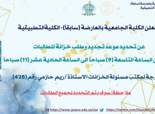 تعلن الكلية الجامعية بالعارضة (سابقاً)-الكلية التطبيقية عن تحديد موعد تجديد وطلب الخزانة للطالبات