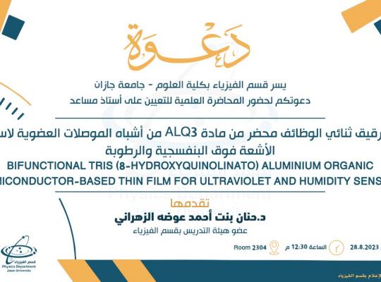 محاضرة علمية للدكتورة حنان الزهراني بعنوان "BIFUNCTIONAL TRIS (8-HYDROXYQUINOLINATO) ALUMINIUM ORGANIC SEMICONDUCTOR-BASED THIN FILM FOR ULTRAVIOLET AND HUMIDITY SENSING JAZAN UNIVERSITY "