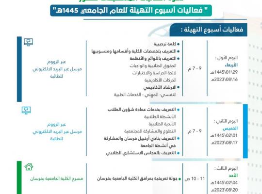 دعوة الطلاب المستجدين لحضور فعاليات ( أسبوع التهيئة ) للعام الجامعي1445هـ